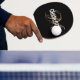 Modern ping pong paddle with an elegant black background, a scripted golden monogram and a white typography name. Personalize with your name and monogram.