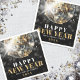 Celebrate in style with this chic New Year’s Eve cocktail napkin featuring a bold black background and festive disco ball details. "Happy New Year" is displayed in a mix of white and gold serif fonts for an elegant and celebratory touch. Below the greeting, there’s space to add the family or host's name along with the year.