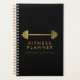 A chic and modern fitness planner to plan and track your fitness journey and success, featuring a faux gold fitness weight icon, "fitness planner" and your name, also in gold. The background is in black.