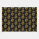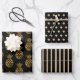Three sheet wrapping paper in coordinating black and gold. Sheet 1 is black with gold pineapples, sheet 2 is a gold polka dot pattern on black, and sheet 3 is a gold striped pattern on black. Contact us for help with customization or to request matching or coordinating products.