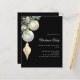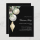 For a Christmas party with family and friends. An elegant, modern black background. Decorated with white and gold baubles and some greenery and a pine cone. Personalize and add the details.