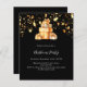 An invitation for a Christmas Party. A black background. Decorated with golden stars and a stack of gifts. Personalize and add the details. White text.