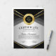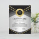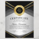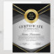 Professional black and gold vertical certificate of appreciation flyer template featuring a grey gradient background and a black and shiny gold medal with a leaf outlining. Perfect for school, businesses, churches, and more! Customize the certificate to your liking.