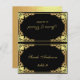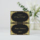 A vintage black and gold wedding place card with the guest name and the table number printed on its front and the bride and groom names and the wedding date printed on the other side (that is the other half, before folding it). It has an antique frame with faux silver foil decorations and also faux silver inside (on the back, before folding it). All text is golden, written in elegant calligraphy. The background is black.
