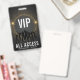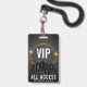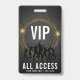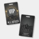 Modern VIP badges. Design features black and gold background with concertgoers icon, VIP script in white lettering and additional information.
