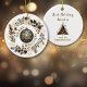 This pretty Holiday ornament features a decorative black and gold tree bulb hanging from a pretty seasonal wreath. Dark gold curved text says "MERRY CHRISTMAS". The back of the ornament has your own custom text in three text fields separated by a stylistic black and gold Holiday tree. Make it say whatever you'd like! Be sure to see the matching products in our store.