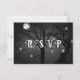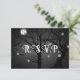 Darkly beautiful, this R.S.V.P. enclosure card continues the gothic Halloween wedding theme with a soft black background and brilliant autumn moon behind candle lit leafless trees. on a softened black. The reverse side is a stone gray with white traditional text adorned with more lush ornate flourish ornaments. Step into a realm where Gothic elements entwine with vintage aesthetics in our Black Gothic wedding RSVP. A celebration of love and darkness awaits, where spirits dance under the moonlight and love's spell knows no bounds.