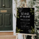 Gothic wedding welcome sign featuring illustration of black roses on a black background. Perfect for your halloween theme wedding.