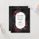 Dark and moody save the date card with Till Death Do Us Part saying, dark red roses, bats and spider webs. Has a smoky black watercolor background. Blackletter typography adds to the gothic feel of the announcement. See our coordinating items as well.