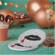 A graphic design of a black goth vampire kiss by artist/designer Charmaine Paulson on paper plate.