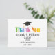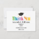 This is a simple and modern design with a black graduation cap, yellow gold tassel, black text and white background. Colorful "Thank you” image. Yellow gold is printed color, not metallic foil.