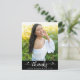 Make sure your favorite grad shows appreciation to all who supported their milestone event! Send out this stunning, simple, modern, personalized photo thank you postcard. A fun, playful visual of white script handwriting and cute, playful hearts, along with her name, class year, and school, overlay a black band.On the front, personalize with the photo of your choice along with your grad’s name and class year. Add a personalized note on the back in soft gray typography, under the black cap icon. Matching announcements, party invites, cap toppers, plaques and other graduation goodies are also available in this trendy and stylish collection. Guaranteed to add stylish fun to her special occasion!