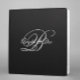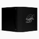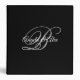 Wedding binder with the bride and groom's names and monogram in a fancy calligraphy script in light gray and white on a black background.