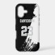 Add a name and number(s) to personalize this custom black, gray, and white, paint splash design, and sports jersey inspired phone case. It is an excellent gift for a sports fan or athlete. The options to change the color and font sizes are available.