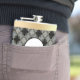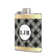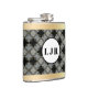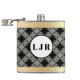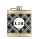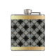 This flask has a black and gray pattern with a gold color band, on the top and bottom of the design. In the center, of the design there's a white circle with an area for monograming. This design can be customized.