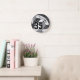 This black, gray and white girls' volleyball wall clock with custom player name and jersey number features a floral kaleidoscopic pattern blended with the black and gray volleyball panels and an artsy abstract swirl pattern blended with the white panels - by katz_d_zynes