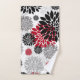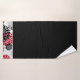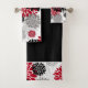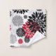 This attractive three piece towel set features a black, gray, white, and red graphic flower pattern as the background. The big bath towel is solid black, with the flower pattern as a bottom border. The hand towel and wash cloth have the pattern, and contrast beautifully with the bath towel. Very dramatic, with a splash of color! Be sure to see the matching home decor products in our store. *Graphic Design credit to Malachi Designs on Etsy.