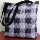Image printed on tote bag is from a photo of an original tapestry crochet creation designed handmade and Copyright © by published designer Delores Chamblin. The textured stitches of the unique handcrafted black and gray shades gingham plaid textile pattern is reproduced on the bag.