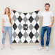 This geometric pattern fleece blanket features a black, gray and white argyle plaid pattern with light gray "stitching" extending diagonally across the diamond shapes - customize with monogram - by katz_d_zynes