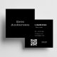 Back: Templates for your name, title, phone number, mail and website address, QR-code to your website or social media account. White text.