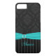 This modern black and gray damask with stripes iPhone 7 case has a turquoise blue PRINTED ribbon and a PRINTED diamond jewel buckle on it. It can be customized with your logo, name, initials, or other text. If you need assistance, email niteowlstudio@gmail.com.
