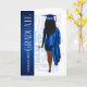 A lovely dark skinned young woman with long black curly hair is dressed in royal blue, wearing a graduation cap and matching gown is draped over her shoulder to congratulate her on her graduation.
