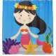 Pretty and cute shower curtain for girls who love the ocean and mermaids, features a cute black haired mermaid, coral, seaweed, seashells, and a starfish on a bright blue background.