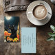 A black cat sits in a doorway with pumpkins, lantern, broomstick, autumn leaves and a full harvest moon in behind