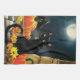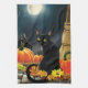 A black cat sits in a doorway with pumpkins, lantern, broomstick, autumn leaves and a full harvest moon in behind.
