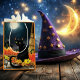 A black cat sits in a doorway with pumpkins, lantern, broomstick, autumn leaves and a full harvest moon in behind.