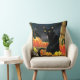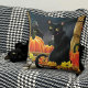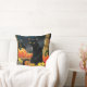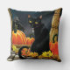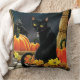 A black cat sits in a doorway with pumpkins, lantern, broomstick, autumn leaves and a full harvest moon in behind.