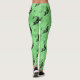 The graphic design, with black Halloween silhouettes of witches on brooms, is repeated for an all-over pattern on a green background. There is a large black stripe on the outside of each leg with the bold text, “Halloween.”