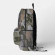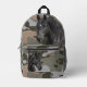 Backpack with camouflage pattern and black horses design. Colors are army green, dark forest green, light gray, and tan. Include a name, in tan, on the zipper pocket, or delete the sample text. Unisex design for boys or girls.