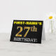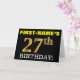 This birthday greeting card design features a message like "FIRST-NAME’S 27th BIRTHDAY!", with the "27th" having a faux/imitation gold-like color appearance. The recipient’s name on the front can be customized, and the front background is colored black. It also features a personalized birthday greeting message on the inside. A birthday greeting card like this could perhaps be given to somebody in celebration of their twenty seventh birthday. [~Z0000183]