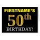 This birthday greeting card design features a message like "FIRSTNAME’S 50th BIRTHDAY!", with the "50th" having a faux/imitation gold-like color appearance. The recipient’s name on the front can be personalized, and the front background is colored black. It also features a personalized birthday greeting message on the inside. A birthday greeting card like this could perhaps be given to somebody in celebration of their fiftieth birthday. [~Z0000183]