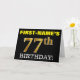 This birthday greeting card design features a message like "FIRST-NAME’S 77th BIRTHDAY!", with the "77th" having a faux/imitation gold-like color appearance. The recipient’s name on the front can be personalized, and the front background is colored black. It also features a customizable birthday greeting message on the inside. A birthday greeting card like this could perhaps be given to somebody in celebration of their seventy seventh birthday. [~Z0000183]