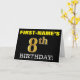 This birthday greeting card design features a message like "FIRST-NAME’S 8th BIRTHDAY!", with the "8th" having a faux/imitation gold-like color appearance. The recipient’s name on the front can be customized, and the front background is colored black. It also features a customizable birthday greeting message on the inside. A birthday greeting card like this could perhaps be given to somebody in celebration of their eighth birthday. [~Z0000183]