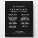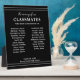This charming white on black school reunion memorial standing plaque is a beautiful way to remember and honor those classmates who have passed, but will always be remembered. There is room for up to 24 names.