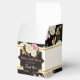 This chic and modern favor box features a colorful floral pattern with a black background and an ivory and simulated gold band around the center with a black and gold-edged bracket-shaped text area on the front and back sides. There is also a larger bouquet with lovely roses in cream, ivory, and pink, with an orange Peruvian lily and green foliage on the front and back above the customizable text. Under the bouquet, custom text says, "Melissa's Bridal Shower" in coral pink with the date of the event in sage green below and the words, "Thank You!" in ivory at the bottom. Email niteowlstudio@gmail.com if you need any matching items or need help customizing the wording.