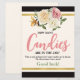 This chic and bold bridal or wedding shower game table card sign matches the bridal shower invitation collection shown below and features a black and ivory color palette with thin stripes of simulated gold across the top and bottom with a pretty bouquet of pink, ivory, and pale yellow roses with an orange Peruvian Lily and green foliage on the top. The words "How many candies are in the jar?" are printed in coral pink and black with instructions for the game and a message of "Good luck!" in black and green below. Pair it with the matching business card and place beside a large jar filled with your choice of candies for a fun game at your wedding event. If you need anything else to match this collection, please email niteowlstudio@gmail.com or use the Zazzle chat to get in touch.