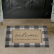 Add a farmhouse style touch to your entryway with this rustic buffalo plaid patterned doormat in dark beige and black with tan accents. "Welcome" appears in the center in casual handwritten script lettering; personalize with your family name beneath.