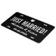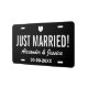 Custom black and white Just married license plate for wedding car. Personalize it with your wedding day / date and name of bride and groom. Custom background color. Funny auto gift for newly weds. Includes little love heart design.