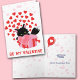An adorable little black kitten sits in a pink gift box and holds a big pink heart. Behind him is a group of red hearts. The text at the bottom says "Be My Valentine". Inside are many more pink hearts, and a red balloon, with two more custom text fields. Make it say whatever you'd like. Great for kids.