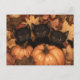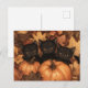 Watercolor illustration of a black kitten trio with a background of autumn leaves and pumpkins.