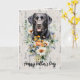 Black lab Father's Day card with message inside. Chess pieces background design with custom greeting on front. The Labrador retriever sits among wildflowers in this design. All parts of the card, inside and out, have a background pattern of chess pieces and hearts in light sepia tones.