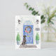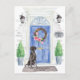 Announce your new address with our stylish announcement featuring a Black Lab, blue front door, welcome mat, slate sign, topiaries and a floral wreath set on a gray brick background.