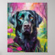 A striking modern art portrait of a black lab set against an abstract pink and green floral garden background. The dog’s dark silhouette contrasts beautifully with the vibrant, swirling colors of the garden, blending nature and animal in an expressive, contemporary style. The abstract brushstrokes create a sense of movement and energy, making this unique piece both playful and visually captivating.