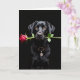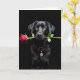 This greeting card shows a shiny black Labrador standing against a dark background. Its smooth coat gleams under soft lighting, and its warm amber eyes look gentle and expressive.