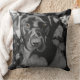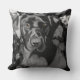 This lovely throw pillow features a gorgeous black glossy Labrador, against a black and white flower patterned background, based on my own pet Tessa.