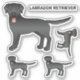 Destei's original cartoon illustration of a cute black coat color Labrador Retriever breed dog. The design is placed four times on the sheet in two different sizes. There is one larger one and the three rest of them are smaller. There is also text that reads "Labrador Retriever".